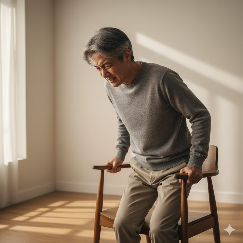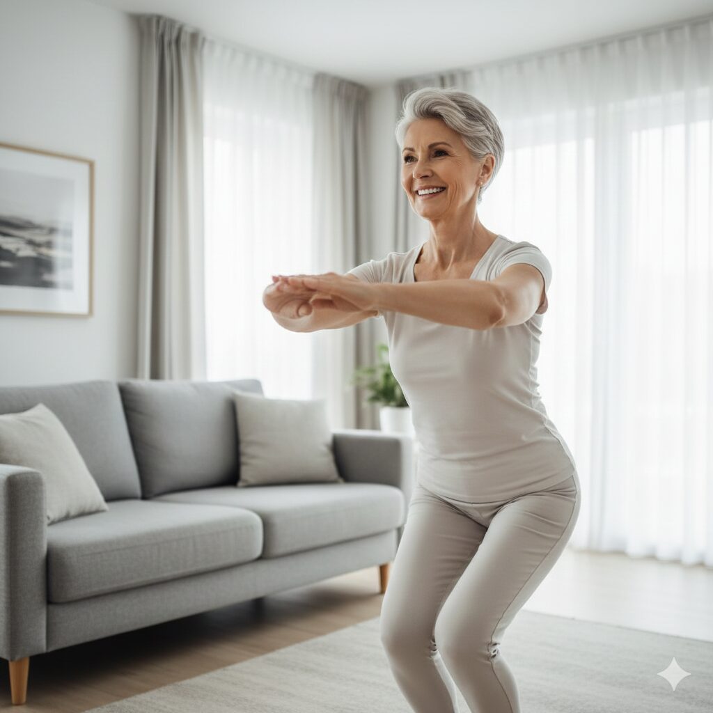 • 의자 스쿼트: 의자에 앉았다 일어서기를 반복합니다. 무릎에 부담이 적고 허벅지와 엉덩이 근육을 강화하는 데 최고입니다. 10~15회씩 3세트.